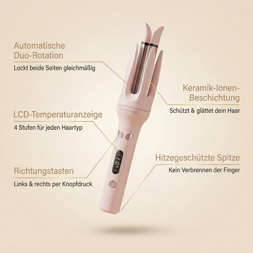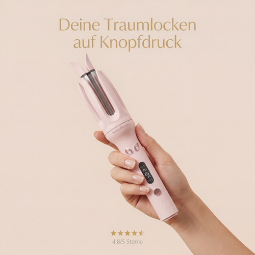 Vergessen Sie mühsames Eindrehen oder Hitzeschäden durch veraltete Lockenstäbe. Unser automatischer Ionen-Lockenstab zaubert Ihnen per Knopfdruck glänzende, langanhaltende Wellen in Rekordzeit.