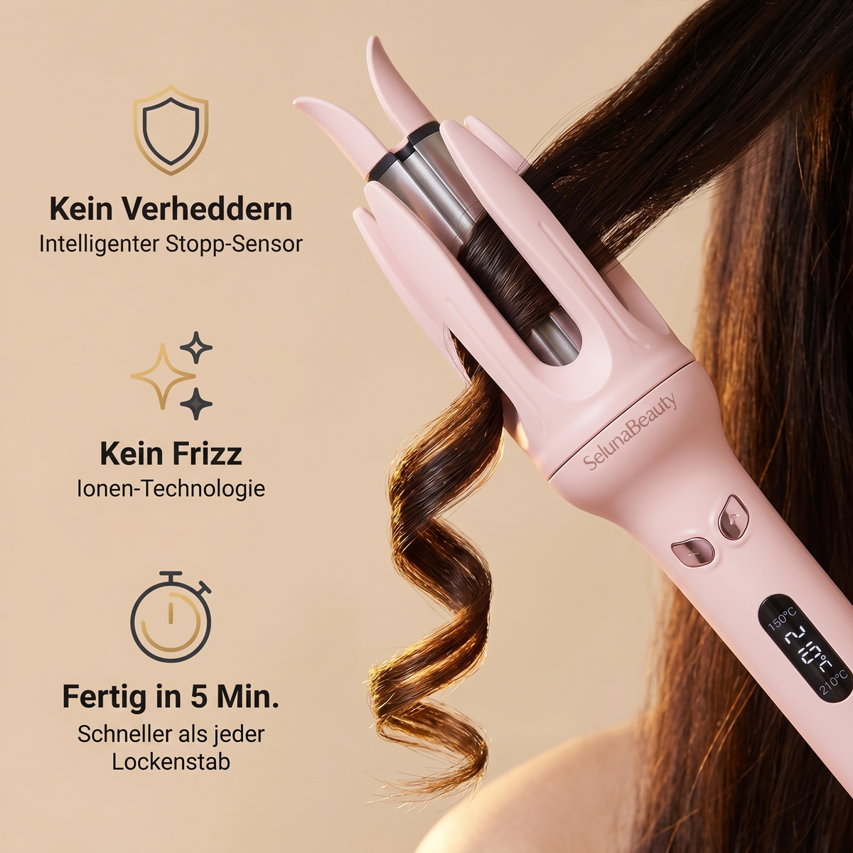 Du kennst das: 20 Minuten vor dem Spiegel, verbrannte Finger, und am Ende sehen die Locken trotzdem ungleichmäßig aus. Mit SelunaBeauty ist das vorbei. Strähne einlegen, Knopf drücken – fertig. Dein Haar wird dabei geschützt statt strapaziert.